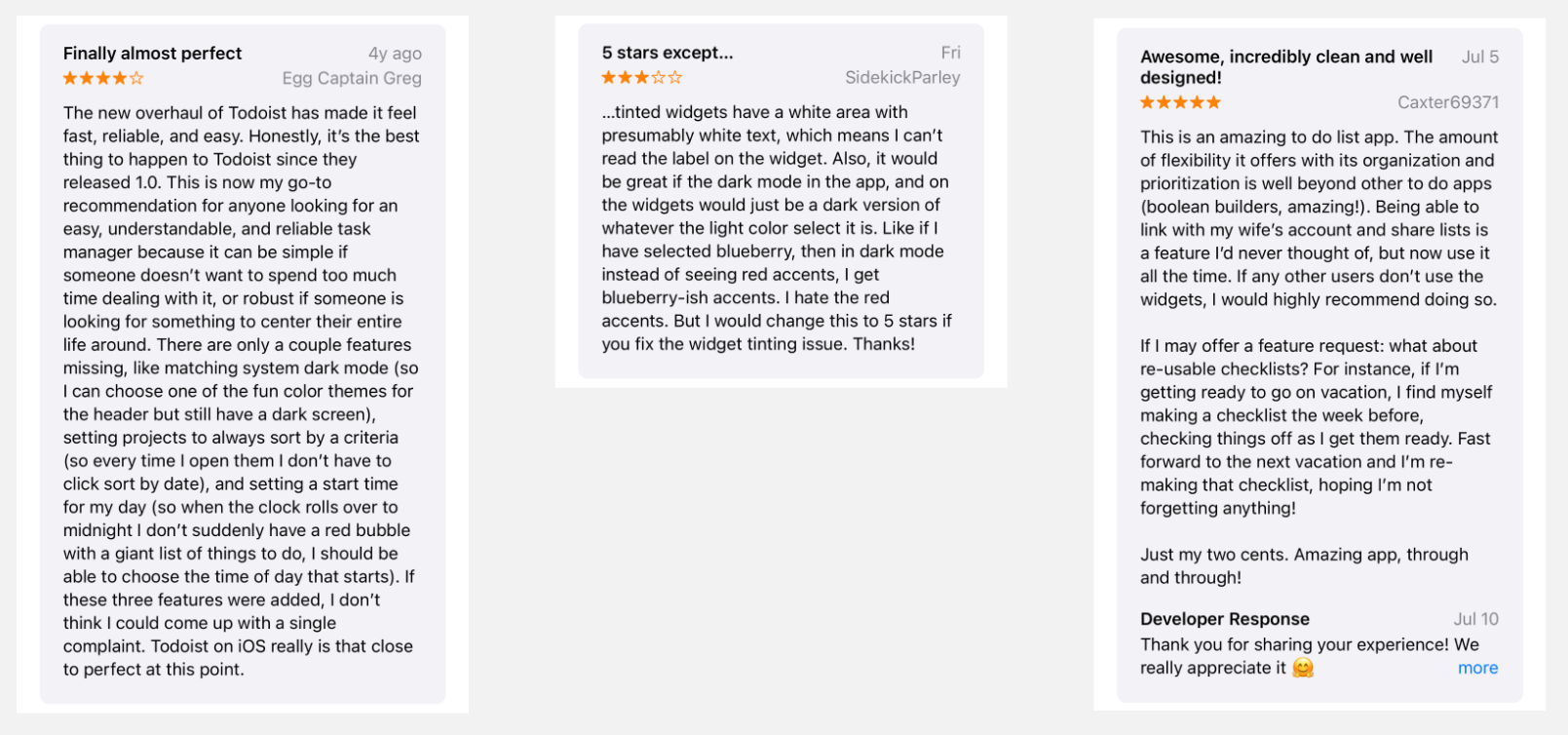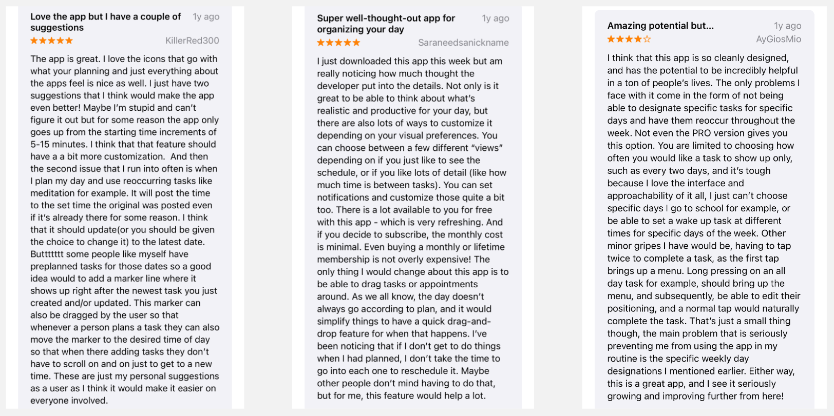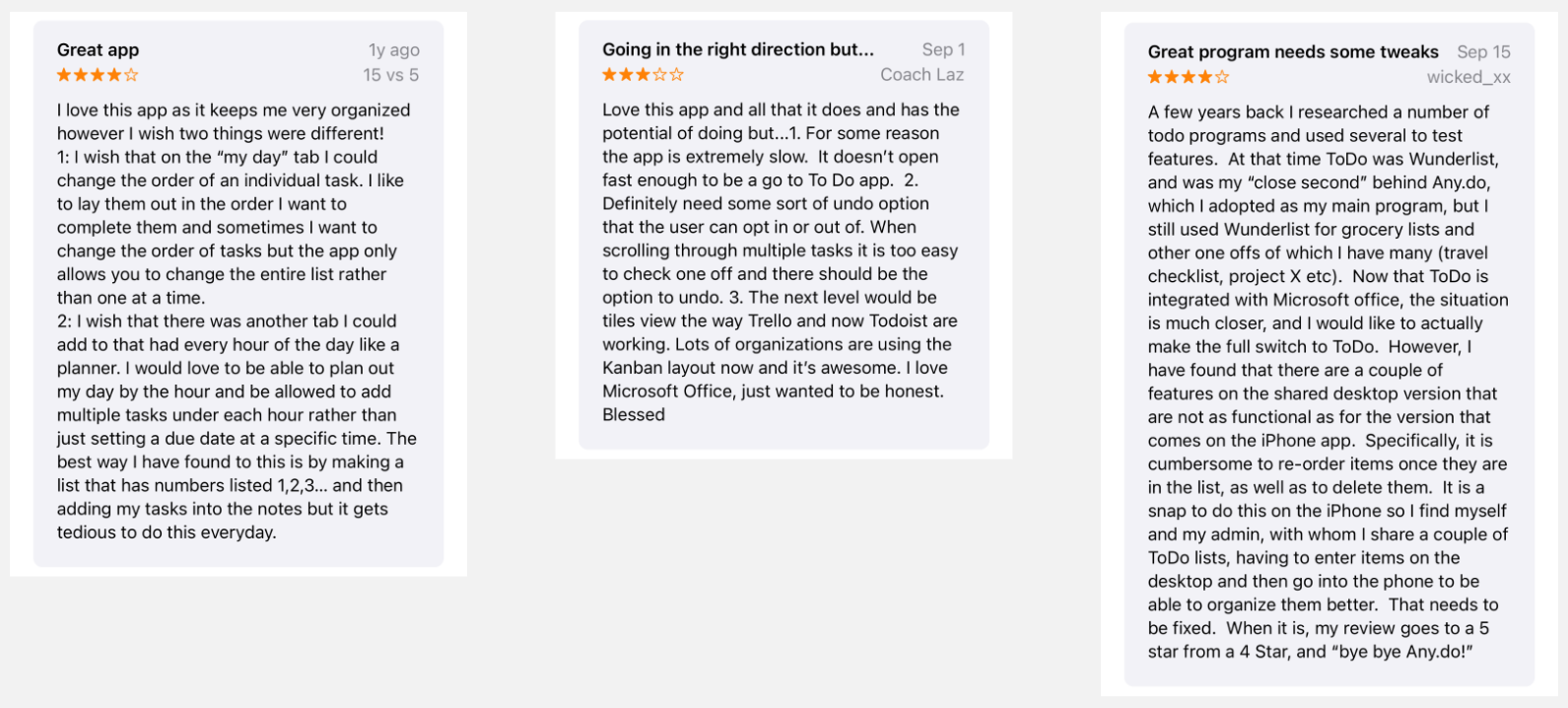 I found that suggestive reviews were mainly very positive with ideas being added with hopes of making it even better for their needs and convenience. For example, a simple drag and drop feature for rearranging tasks or pressing gestures to do different actions.