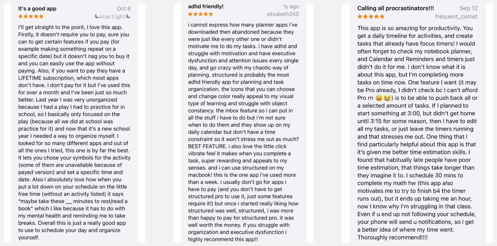 I saw many positive reviews expressing love for the app and how helpful it is, especially for those with ADHD. People liked the free version and appreciated that besides a subscription model, there was a single, lifetime purchase available for those who wanted it.
