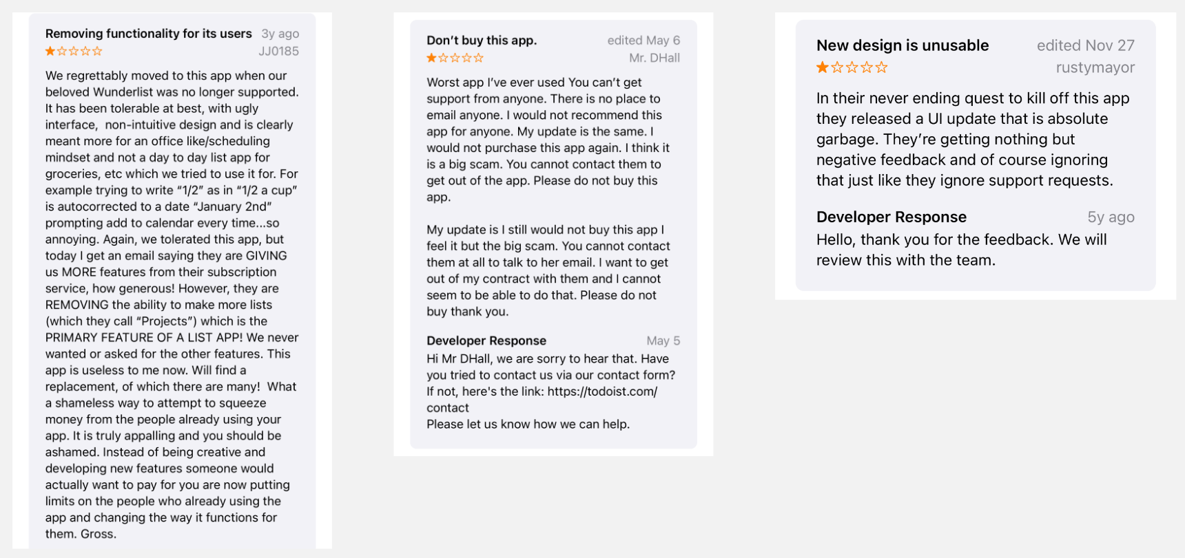 Something I noticed with Todoist reviews was how the majority of them had replies from the developer. They were mostly generic, but they extended links for users to submit feedback or get help with their current issue.