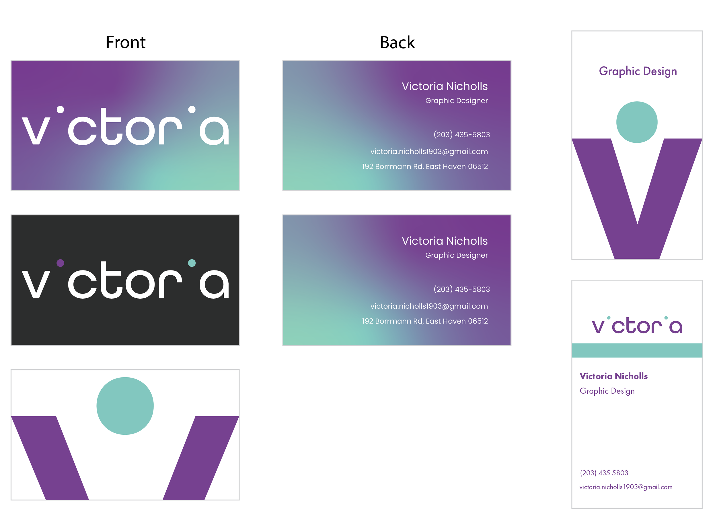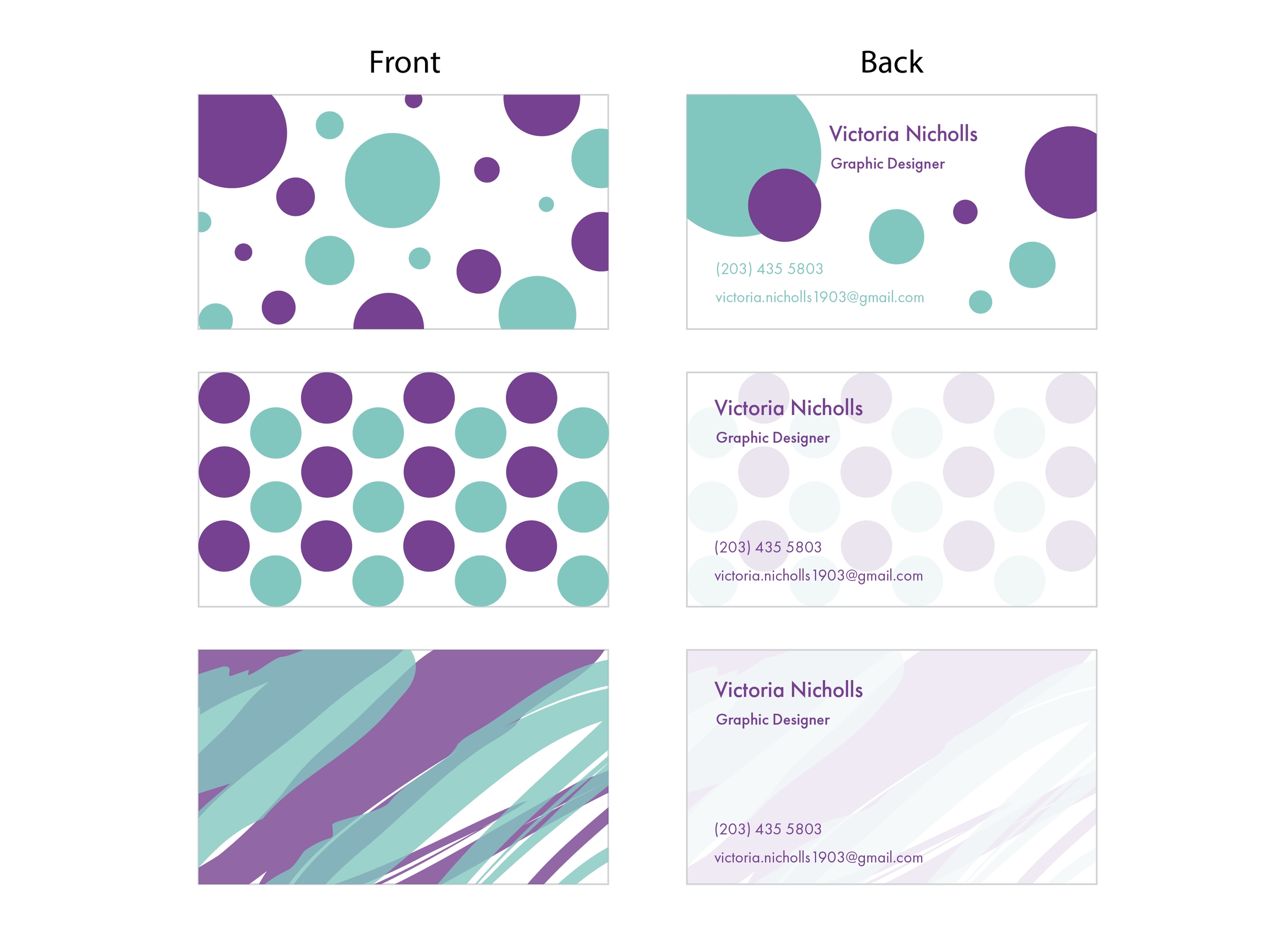 On my first set of business card designs, I used my logos on the front. I also tried to make both sides feel connected. For example, the first card has a gradient and the back has what the gradient would look like when it is flipped. Similarly, the two dots on the second card line up with where the colors would be on the back.